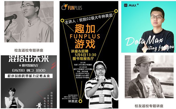 校区将每年的11月份定为“科技文化节”活动月,期间举办有十余项不同技术方向的科技竞赛活动、年度优秀创新创业项目展示活动、毕业校友返校交流等活动;每年4月份,面向高水平科技竞赛,开展以大型赛事选拔为主的“极客嘉年华“活动,每年的“极客嘉年华”和“科技文化月”成为引爆学生创新活动的重要引擎,逐渐成为了软院“极客”切磋与交流的技术盛宴;不定期开展”创业大讲堂“,邀请创业者现身说法,开展创业分享、交流活动,为在校学生提供不一样的视角和前沿信息分享;不定期邀请优秀毕业校友返校开展专题交流活动,促进新老成员互动和衔接。